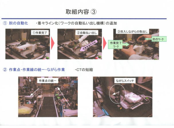 手法2:「線引き作戦」用途に合わせた床の色を決めたら、それらを区画する線を引くやり方。通路と作業区を分ける区画線、右側通行、左側通行の矢印通行線、出入口線は破線、注意を促すタイガーマーク、仕掛り、作業台などの置場線等。